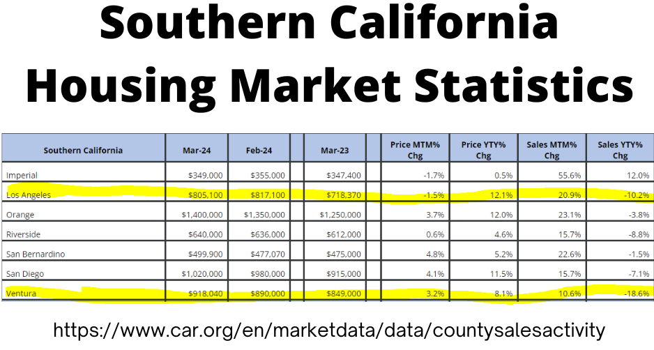 In the Los Angeles County housing market statistics the median price fell 1.5% in March. This is very similar to what happened from Feb to March last year. Median price increased 3.2% in Ventura County which is not quite as high as the 5% increase last year same time. Median price is still up 12% in Los Angeles County from same time last year while Ventura County is up 8% according to the California Association of Realtors.